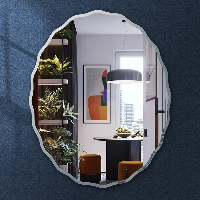 • ✨Unique Frameless Beveled Mirror: The irregular oval shape of this hanging mirror adds an eye-catching dimension to any living room decor. This irregular wall-mounted mirror easily fits into multiple design motifs like modern or vintage bathrooms, bedrooms, hallways and kitchens